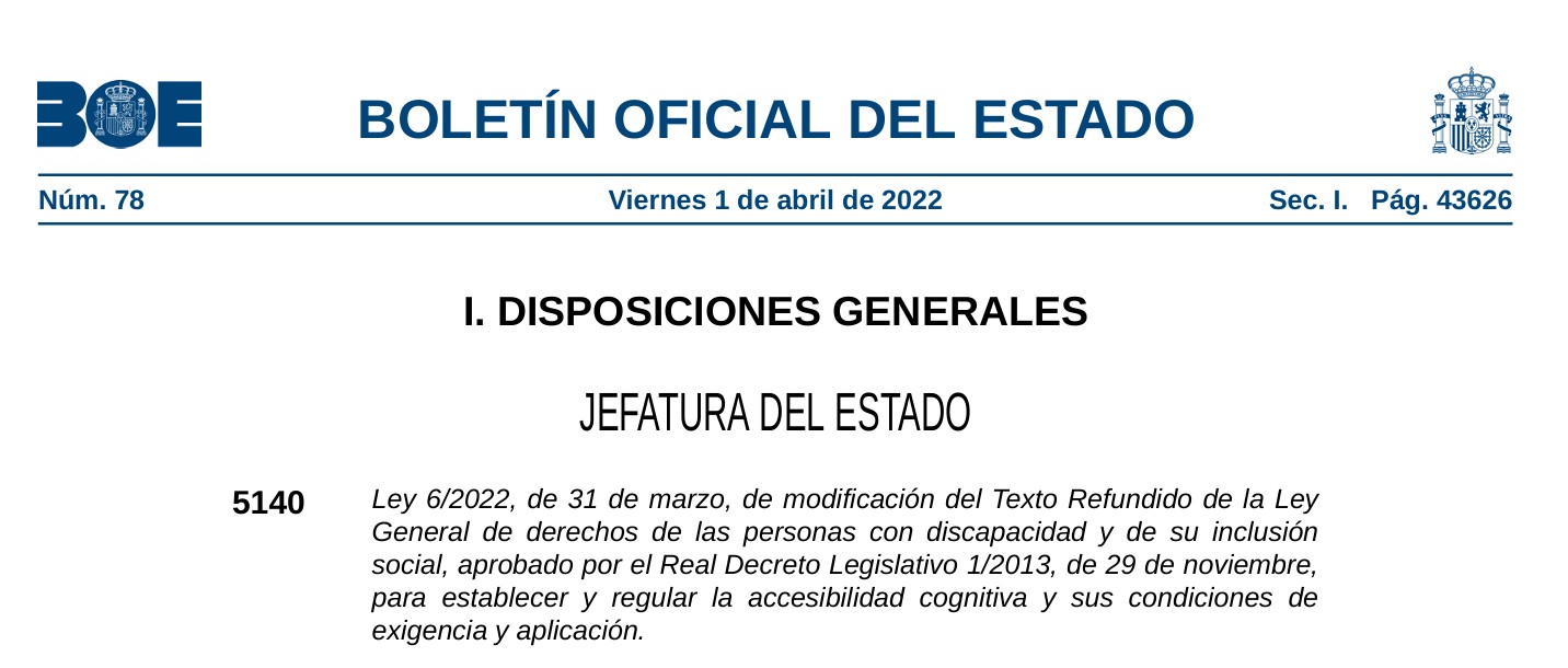 En España, la accesibilidad universal se ha integrado en diversas leyes y normativas. Una de las más destacadas es la Ley General de derechos de las personas con discapacidad y de su inclusión social, aprobada en 2013 y modificada en 2022. Esta ley tiene como objetivo garantizar que todas las personas, sin importar sus capacidades, tengan igualdad de derechos y oportunidades. Según esta ley “la accesibilidad universal es la condición que deben cumplir los entornos, procesos, bienes, productos y servicios, así como los objetos, instrumentos, herramientas y dispositivos para ser comprensibles, utilizables y practicables por todas las personas en condiciones de seguridad y comodidad de la forma más autónoma y natural posible”.
